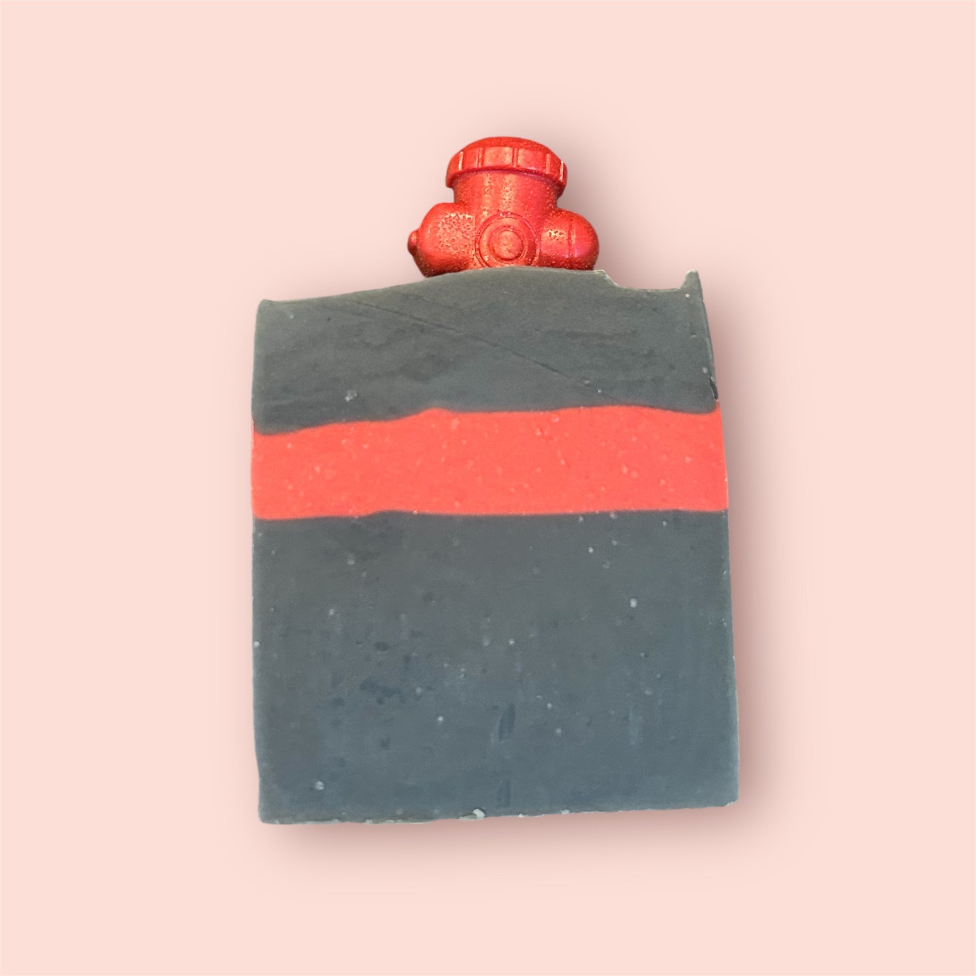 What The Soap: Back The Red soap is an black bar with a red mica line and topped with a axe, flame, first aid, or fire hydrant embed made of melt and pour on top.