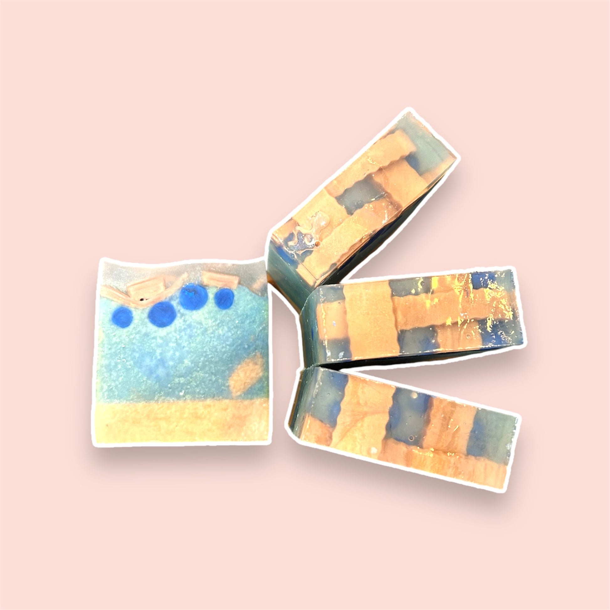What The Soap: Blueberry Cobbler is one of the best smelling dessert soaps! This reminds me so much of a natural blueberry cobbler cooling on your counter. This soap was made with a cream base, and a blue main color mica. The soap is then topped with soap dough blueberry's, pie "crust" and clear melt and pour to give a glazed topping.