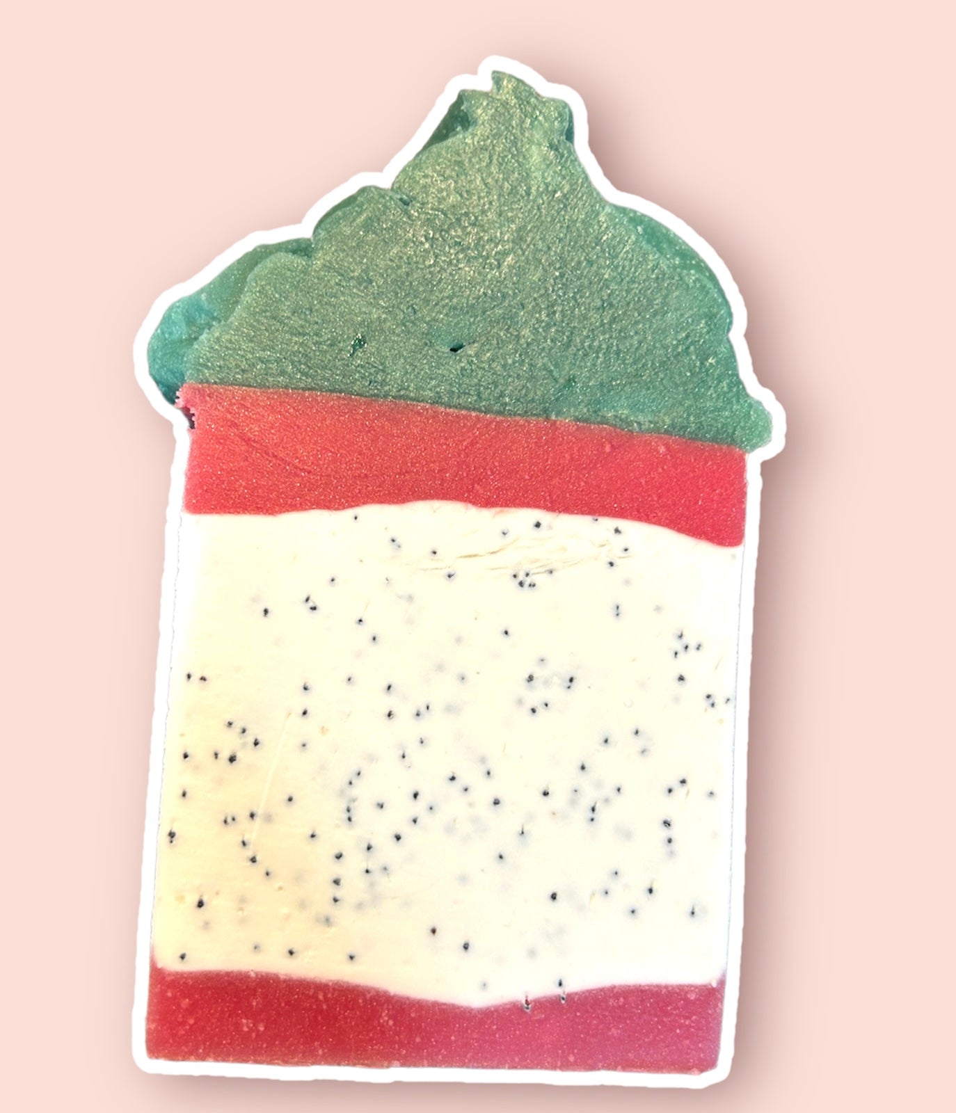 What The Soap: Dragonfruitista is designed to look similar to a Dragonfruiit, one of my favorite fruits. This bar was originally inspired by @CainKerner. This bar is surrounded with a pink lining and filled with white colors and poppy seeds for added exfoliation. The bar was then frosted with two tones of green.