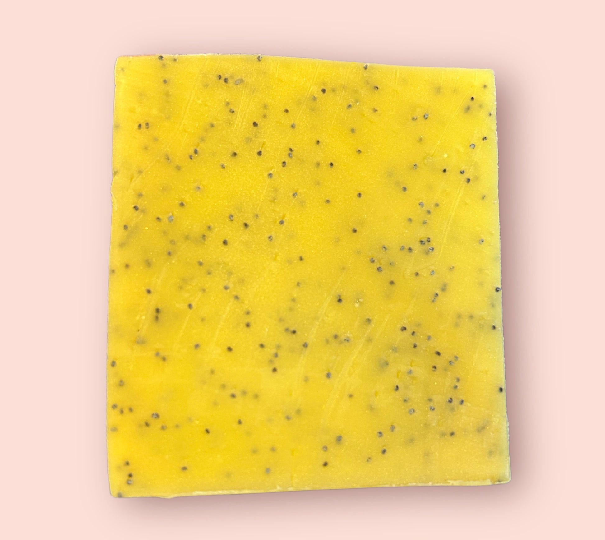 What The Soap: Ello Poppy is a yellow soap filled with exfoliating poppy seeds to give a great lather while moisturizing and exfoliating your skin.