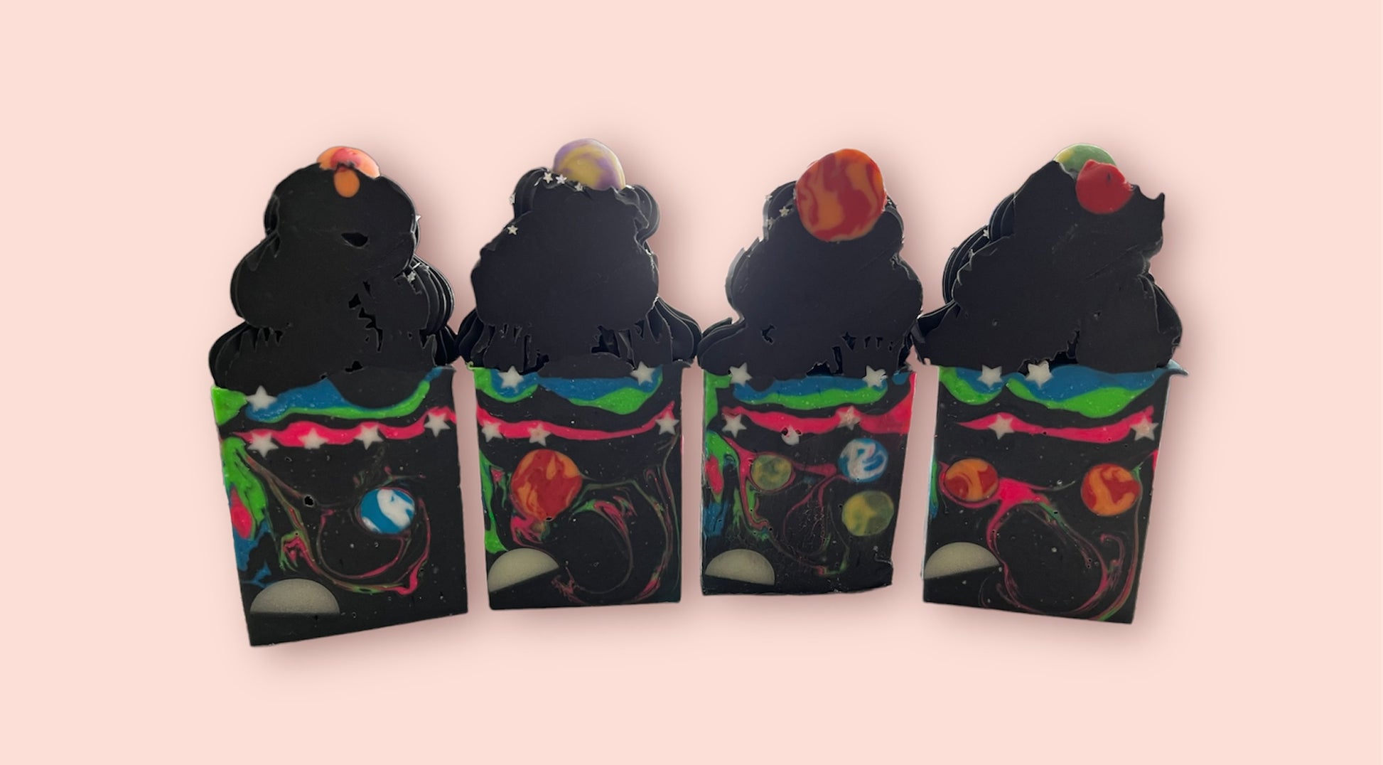 What The Soap: Far Far Away is a activated charcoal soap with soap dough planet and star embeds and a glow in the dark melt and pour moon! This soap is frosted and topped with biodegradable glitter and a soap dough planet on top!