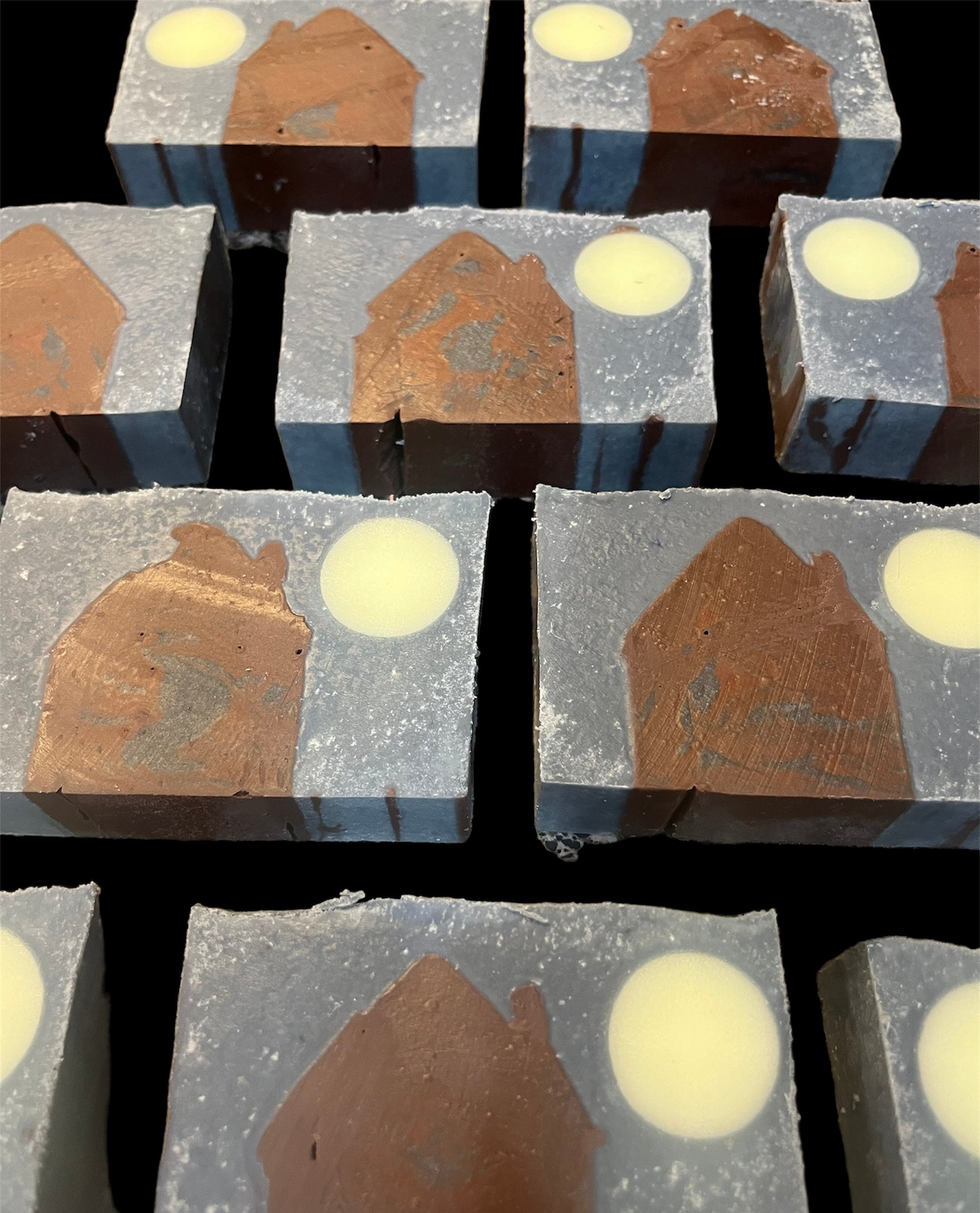 What The Scent: Lighlty scented with Sweater Weather. There is only scent added to the house portion of this soap. Sweater Weather is described as a burst of fresh air tingles with mint as it opens this festive blend, Snow covered pine needles are sweetened with winter berries and laced with wood notes that lead to the velvet mossy undertone. Lingering sweetness of vanilla musk finishes the scent.