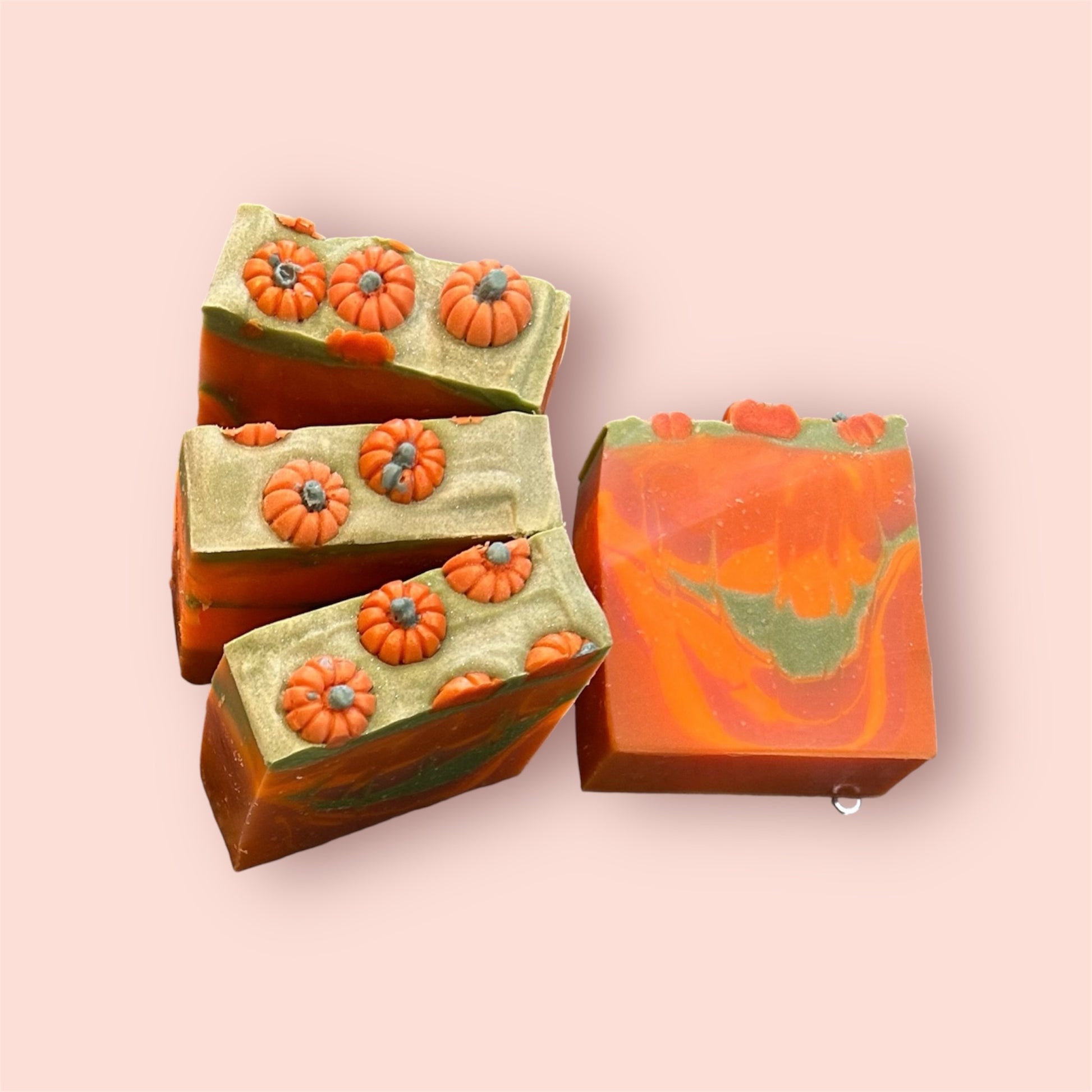 What The Soap: Pumpkin Patch is a pumpkin scented soap made with three shades of orange, including neon and some green. The top of the soap is green for all the pumpkin soap embeds to sit as if it’s on its own bubble pumpkin patch.