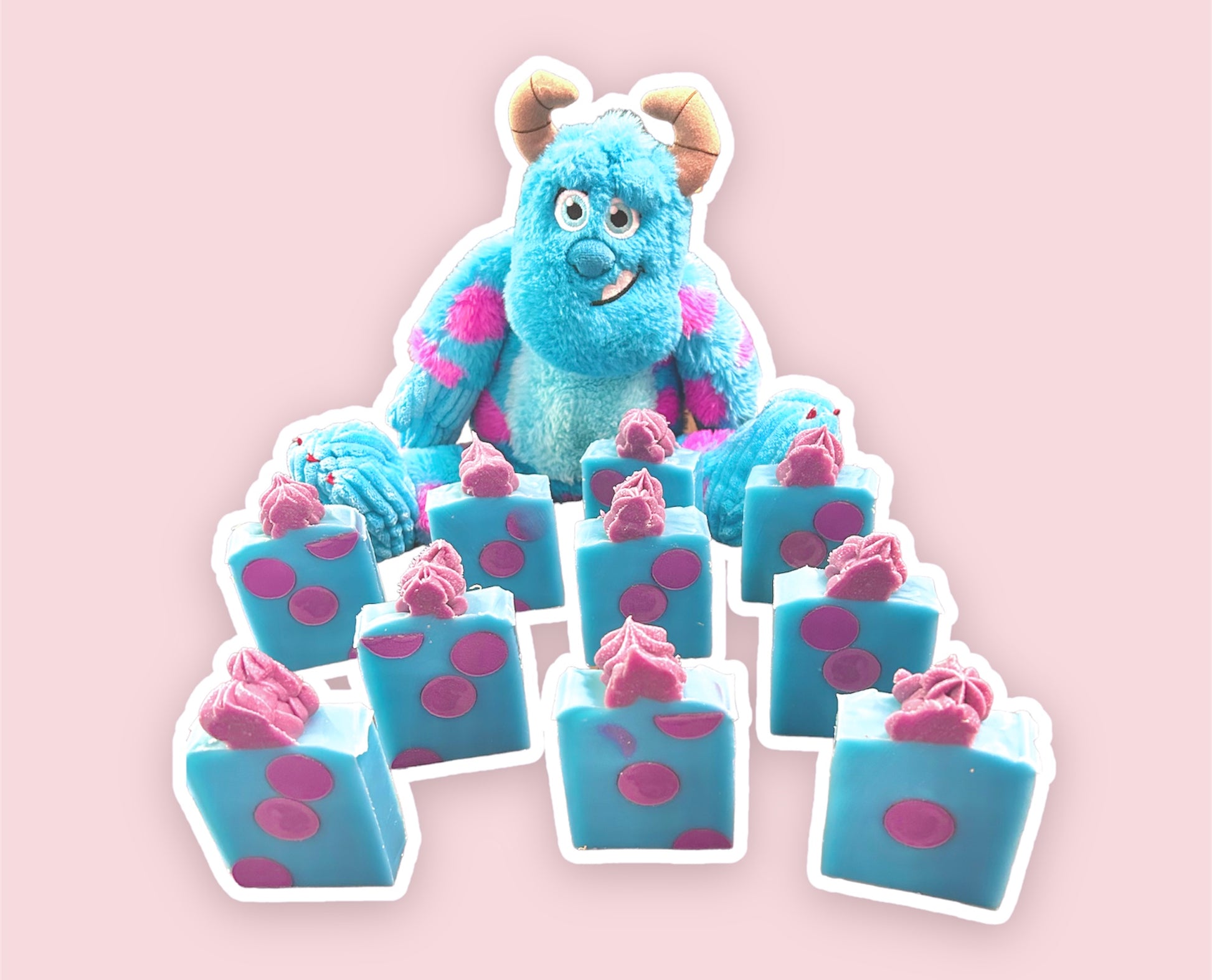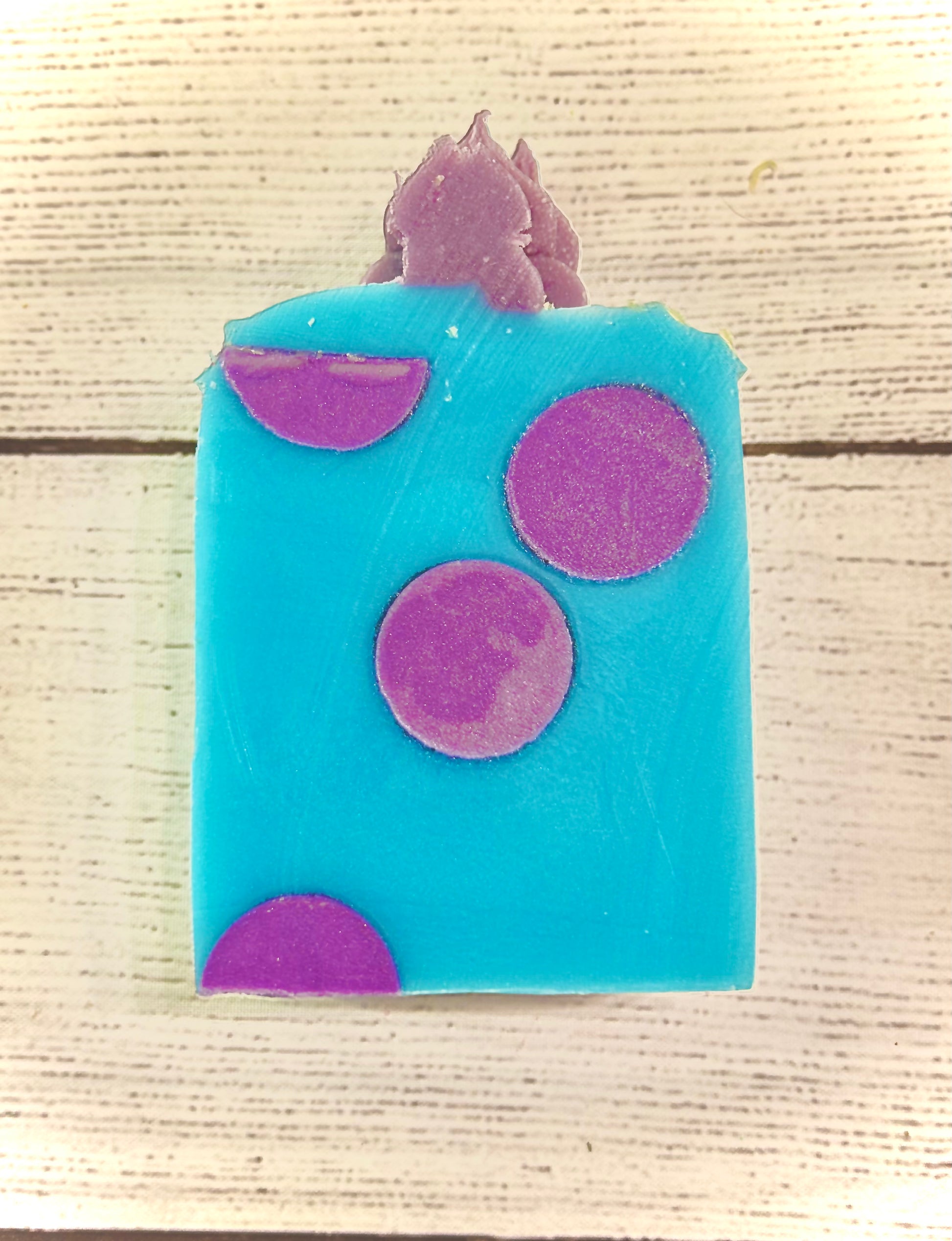 What The Soap: Sully Soap was inspired by Monsters Inc. This is a gorgeous blue base with purple polka dots and a frosted purple back!