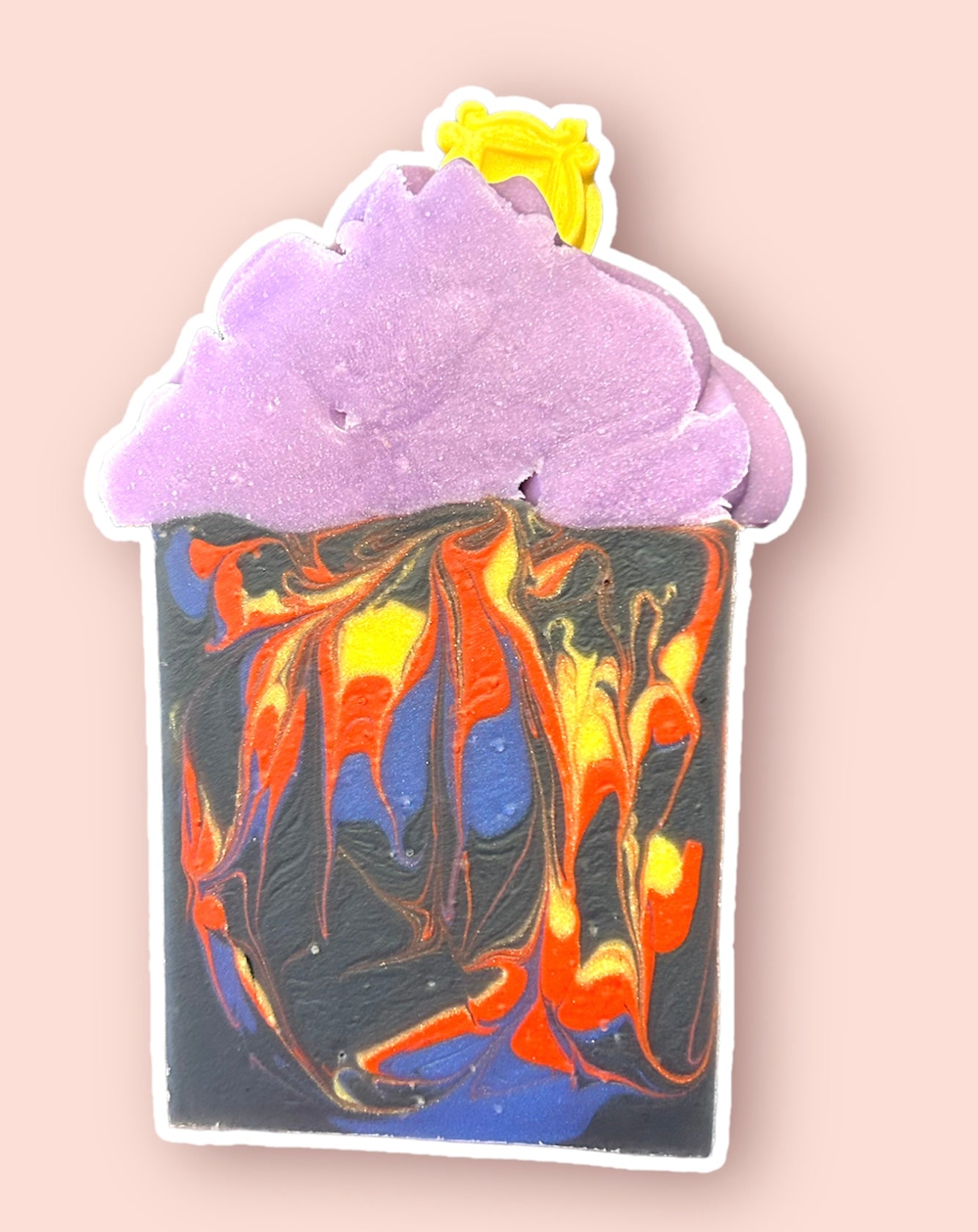 What The Soap: The One With Suds is a Friends inspired bar. The base representing the iconic F•R•I•E•N•D•S logo with an activated charcoal base and hanger swirls of red, blue and yellow as the dots between the letters. The soap is then frosted with the purple door color and embedded with a melt and pour yellow frame.