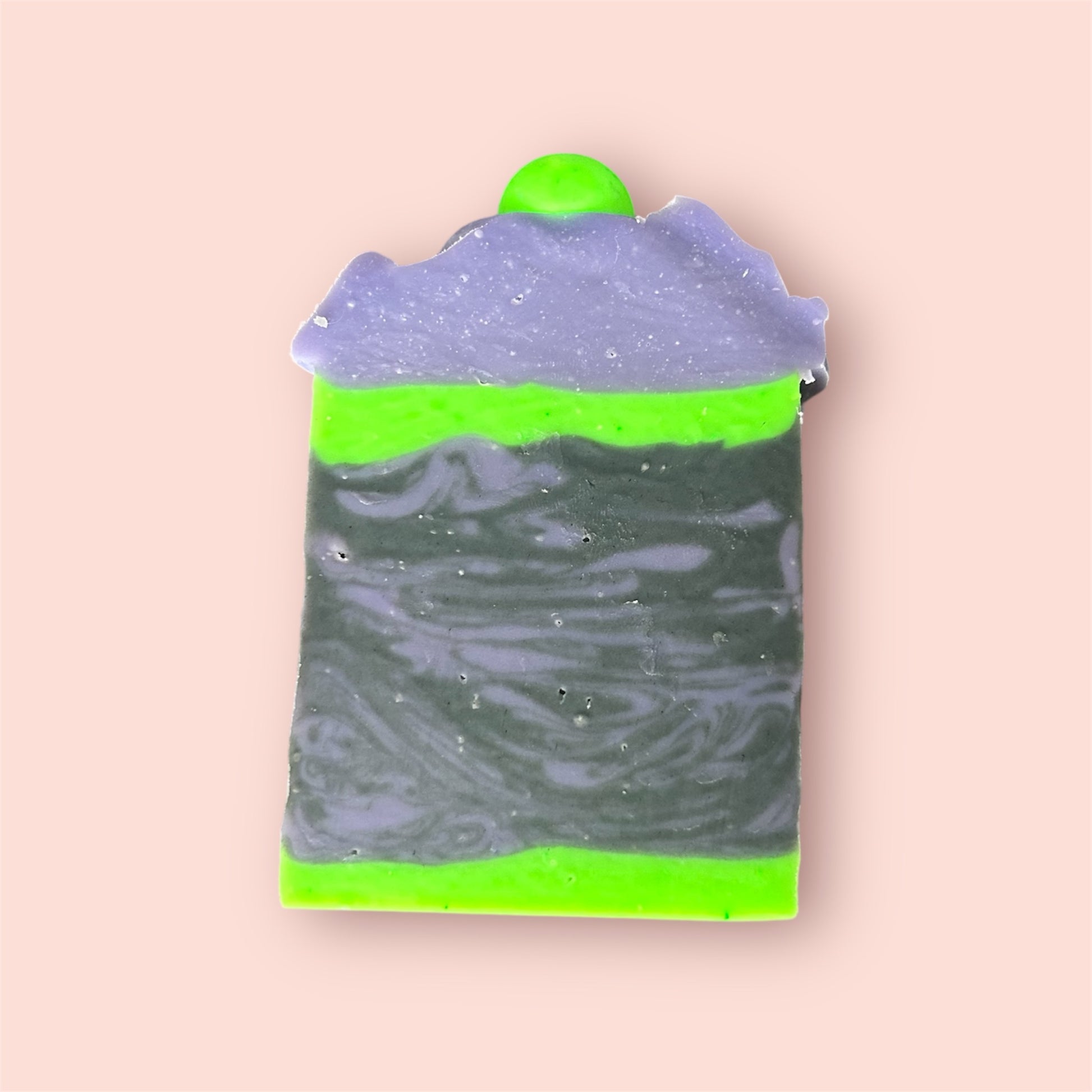 What The Soap: This soap was inspired by a TikTok friend, Julie, who suggested a black and purple Halloween soap! Along with the help of the viewers, we did a neon green base, in the pot swirl with black and purple, and a matching neon green band at the top. This soap is also frosted with a melt and pour embed.